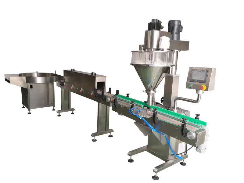 1.全自動粉末瓶裝灌裝生產(chǎn)線:理瓶機 →自動上料機 →單頭粉末灌裝機 →旋蓋機(或封罐機)→瓶口鋁箔封口機 →貼標機 →噴碼機 →鏈板輸送帶 →裝箱平臺,可以根據(jù)產(chǎn)品的要求選擇流水線配置